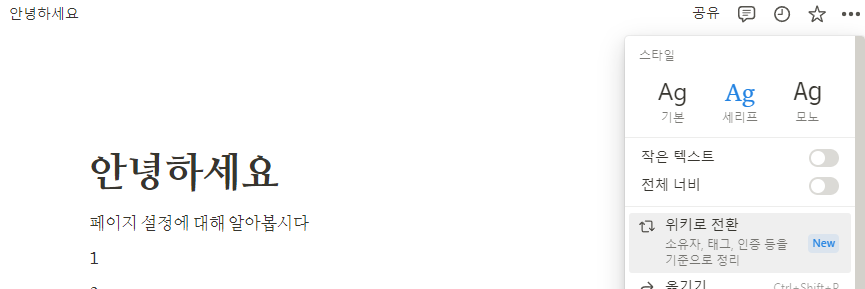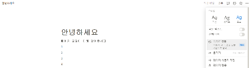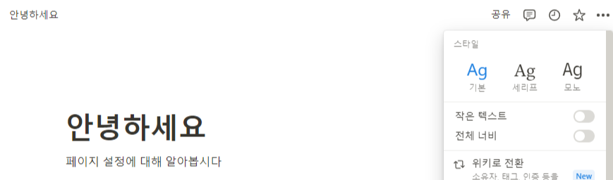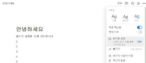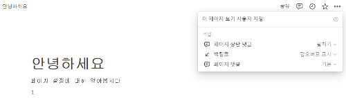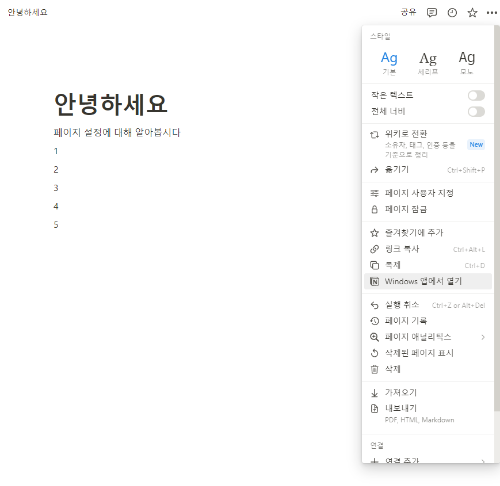 페이지가 보여지는 스타일, 방식, 내보내기 등 다양한 설정을 확인해봅시다.